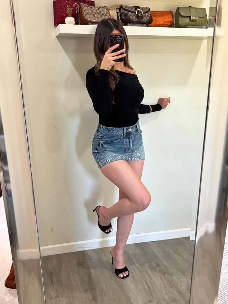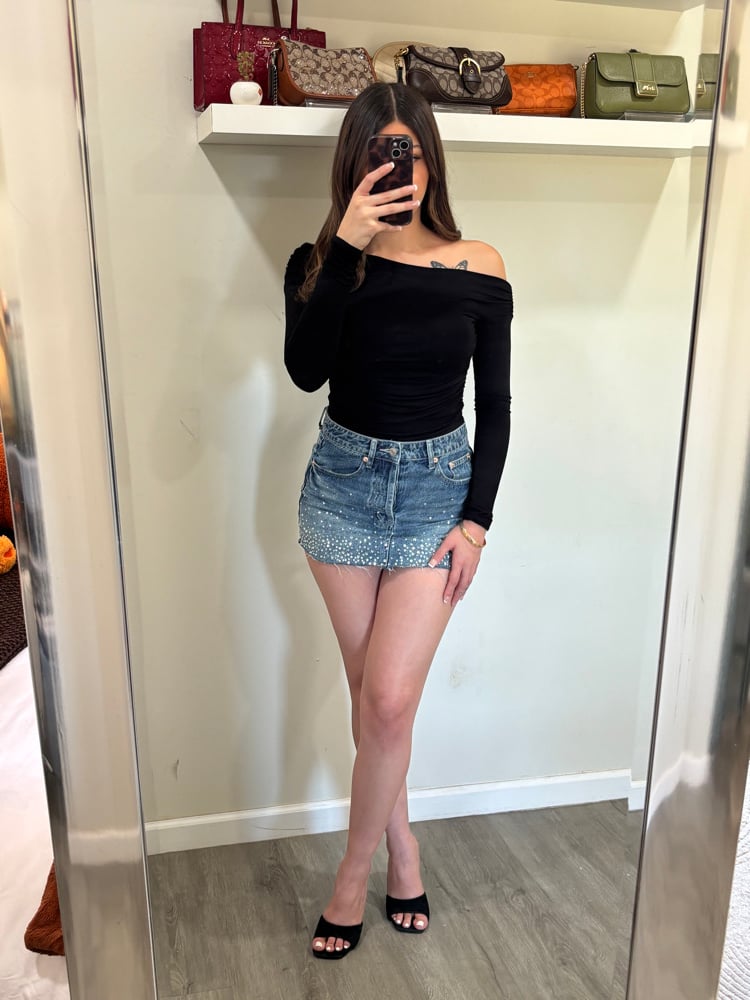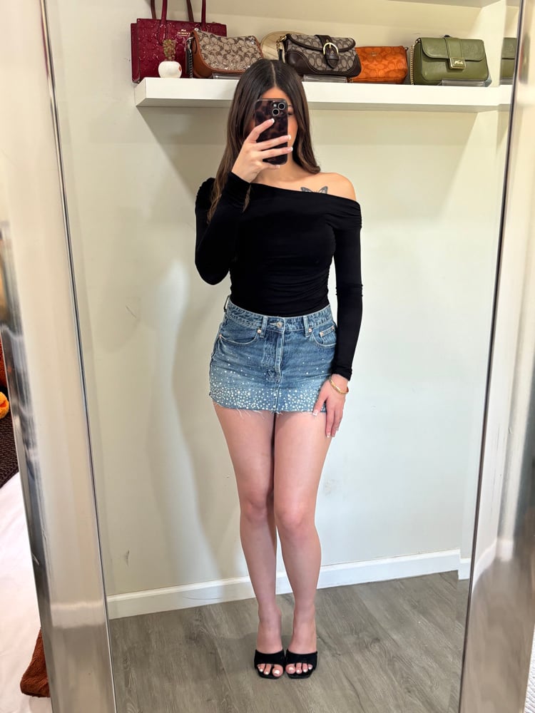denim mini skirt silver rhinestone studs button up true to size model wearing a size small model is 135lb and size 5-7 in pants final sale
