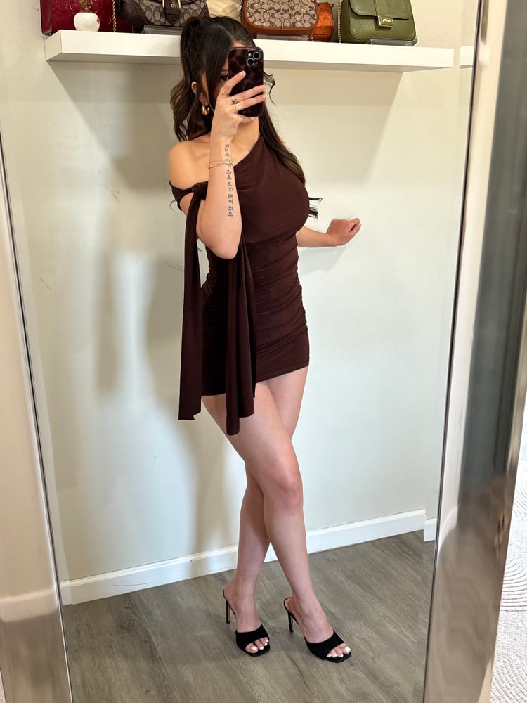 mini dress brown double layered side tie off shoulder ruched stretchy true to size (model wearing a size small)